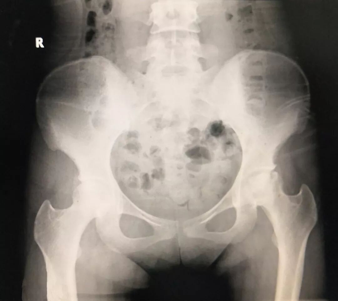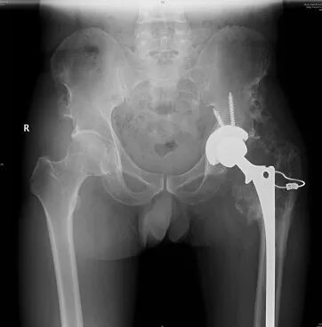 術(shù)前顯示:左側(cè)髖關(guān)節(jié)被腫瘤侵蝕嚴(yán)重