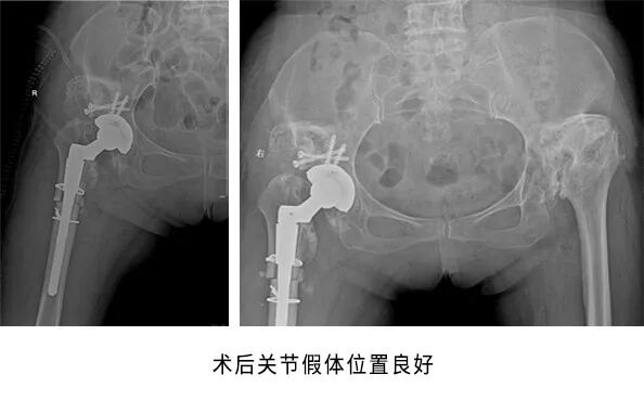 術(shù)后右側(cè)鉭棒植入,左側(cè)假體位置良好