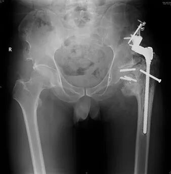 根據(jù)病史及患者體格檢查的相應(yīng)癥狀,考慮患者為左側(cè)股骨粗隆間病理性骨折,屬于原發(fā)性疾病導(dǎo)致的骨轉(zhuǎn)移。趙凱教授為其進行了“左側(cè)股骨粗隆病理性骨折病灶清除術(shù)+截骨術(shù)+人工髖關(guān)節(jié)置換術(shù)+左外髖外展肌群重建術(shù)”。術(shù)后患者病情穩(wěn)定,恢復(fù)良好。