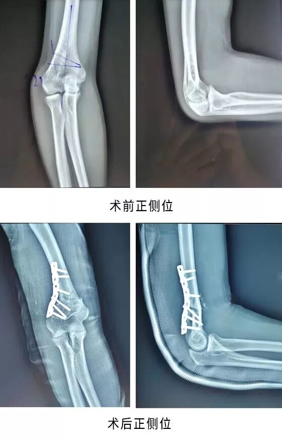 趙凱教授帶領(lǐng)四肢關(guān)節(jié)組團隊,為小王順利完成了“右側(cè)肱骨截骨矯形術(shù)”,術(shù)后小王右肘關(guān)節(jié)由內(nèi)翻10°矯正到正常的提攜角10°,很好的達到了治療效果,截骨部位均已順利愈合,患者回歸正常學(xué)習(xí)、工作及生活中。